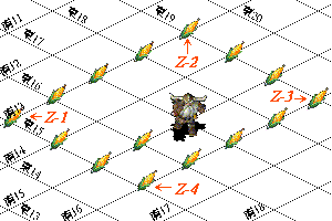 | 最后发现第四个也就是最后一个边界点Z-4 东13南16。 | 如此便完成新发现採集物 "玉米" 的范围调查,除去A点外可得採集范围 Z-1(东15南13)、Z-2(东19南13)、Z-3(东19南16)、Z-4(东15南16)。 |